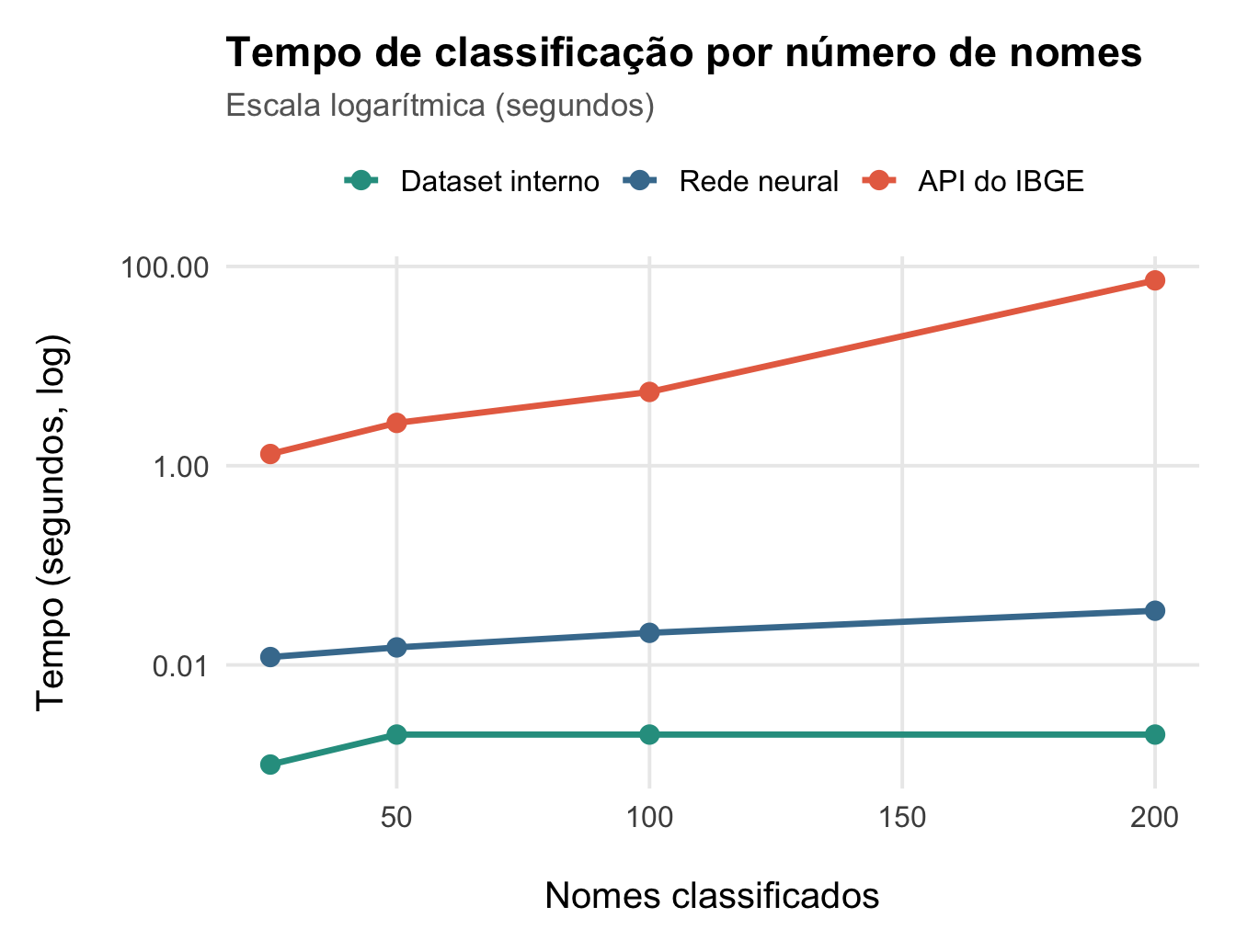 O genderBR oferece três formas de classificar nomes: dados do Censo (armazenados internamente no pacote para uso offline e otimizados para consultas rápidas); a nova rede neural (método offline, rápido); e a API do IBGE (método online, mais lento). Para ilustrar as diferenças de performance, o código abaixo cronometra a classificação de 20 nomes com cada método: